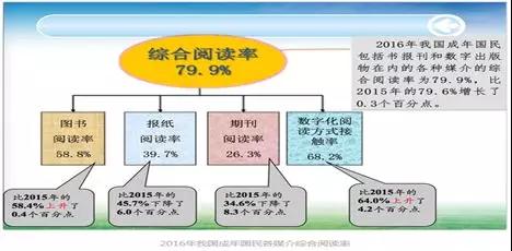 第一,阅读方式方面,面对信息时代的海量资源,数字化阅读渐成主流阅读方式,截至2015年,我国成年国民数字化阅读方式的接触率已达64%,连续7年持续上升。通过终端设备尤其是便携的移动终端进行碎片化阅读、泛阅读成为阅读新特点。